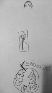 Tomó una hoja, dibujó una lápida con una inscripción, el cajón con el abuelo muerto, una boca que mostraba abiertamente dientes, y abajo escribió ENOJADO. Acá apareció por primera vez una escritura ligada a su vida, no a los personajes que copiaba. Una escritura que representaba, que tenía valor simbólico. Una escritura subjetivada dentro de una escena que representaba algo de su vida, de sus lazos afectivos. Como señala Roland Barthes la escritura constituye “… una práctica significante de enunciación” (Barthes, 2013).