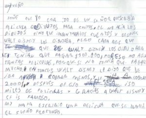 Soñé que yo era hijo de un señor que escribía películas de dibujos para chicos. Él no hacía los dibujos, sino que inventaba los cuentos y después Walt Disney los dibujaba, pero cada vez que Walt Disney lo dibujaba le tenía que pagar cien mil ($100.000) por eso no hacía tantas tantas películas porque si no tenía que pagar mucho. Entonces Walt Disney le dijo que le iba a pagar dos mil ($2.000). Después de eso mi papá hizo miles de películas y gracias a Walt Disney se hizo famoso.